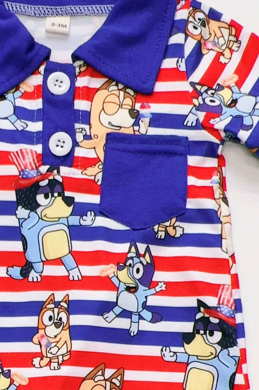 Blu*y patriotic baby romper with snaps.