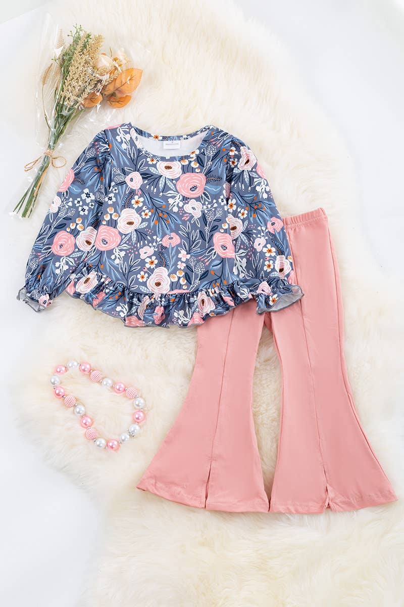 GRAY FLORAL RUFFLE TUNIC WITH MATCHING BOOTCUT PANTS FOR GIRLS.