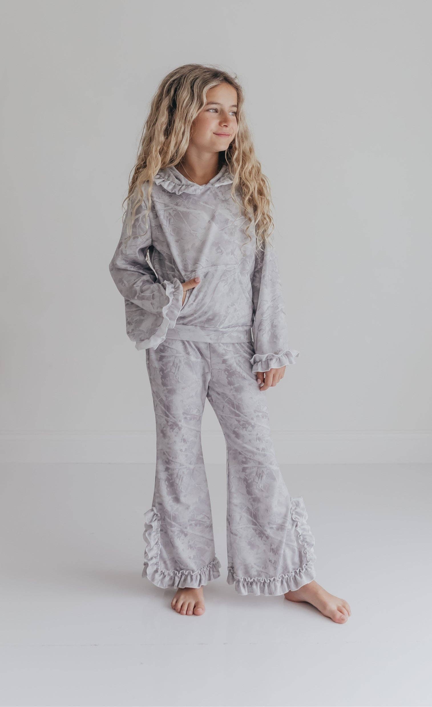 This two-piece hooded set features light gray and white camo print for a on trend look. The flare bottoms and wide sleeves are accented with charming ruffles, while the hood adds cozy comfort. Perfect for lounging in style and embracing a fun, relaxed vibe.