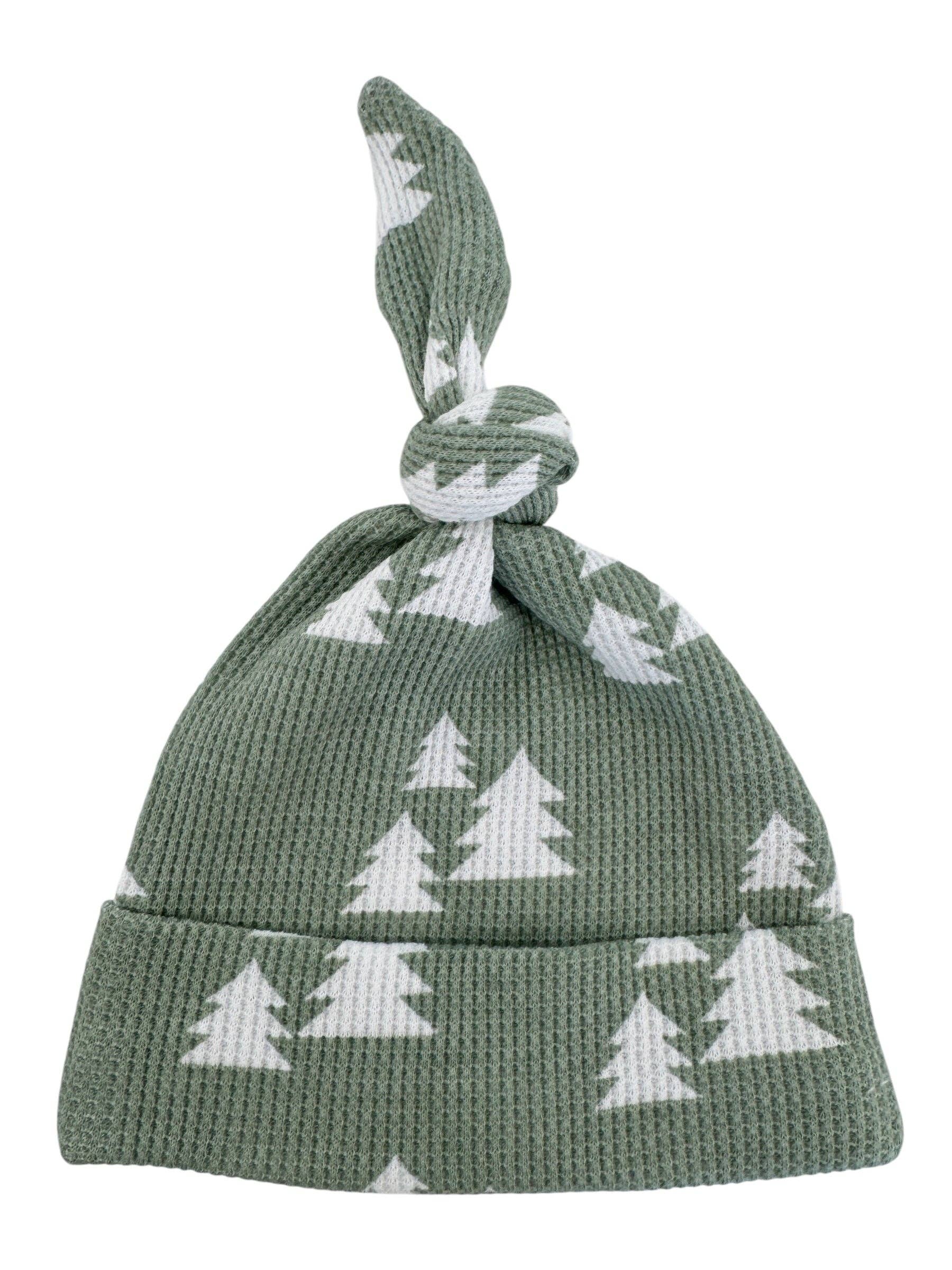 Introducing our Alpine Trees Waffle Knot Beanie - the perfect newborn essential for keeping your little one cozy and cute. Made from 100% organic cotton with a soft waffle texture, this adjustable knot beanie provides a snug, breathable fit for babies 0–3 months.