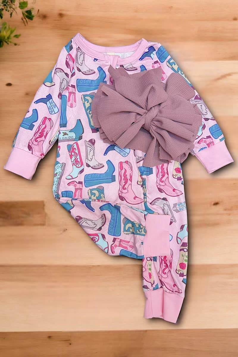LT. PINK MULTI-PRINTED WESTERN BOOT BABY GIRL ROMPER WITH PINK TRIM.