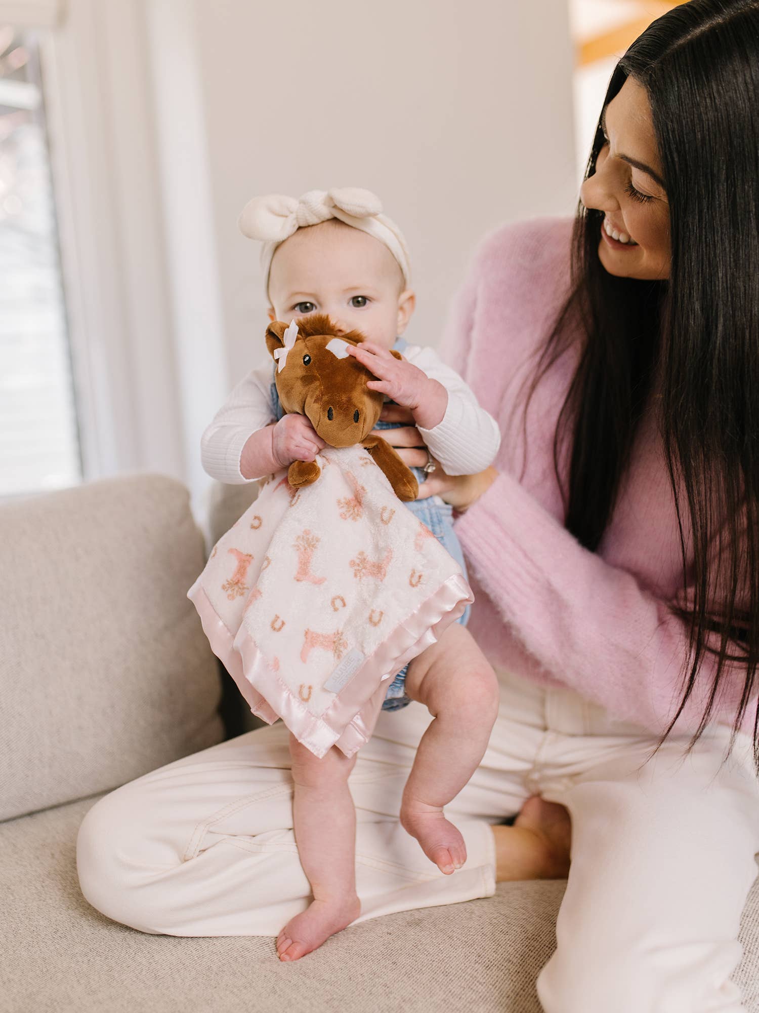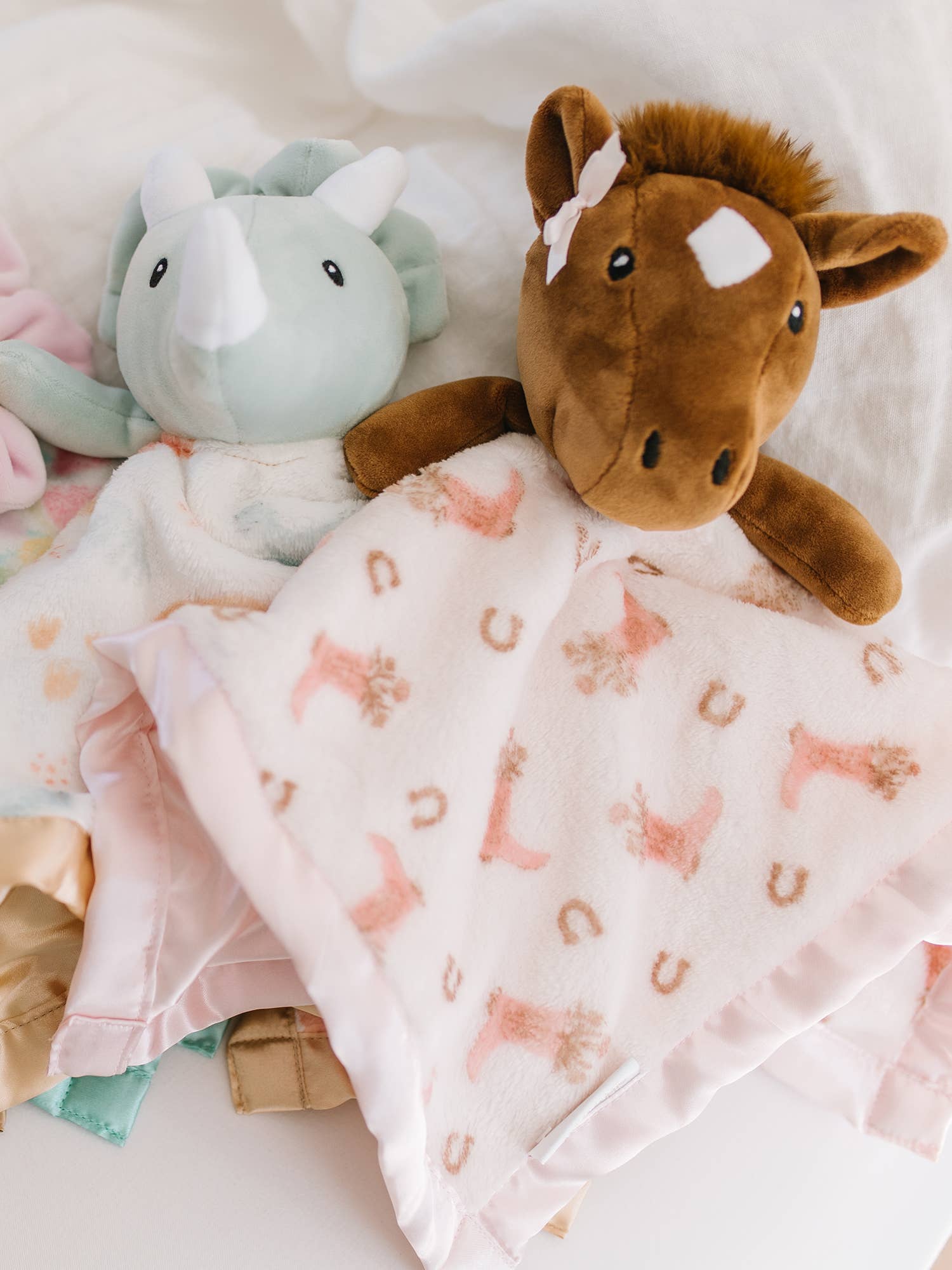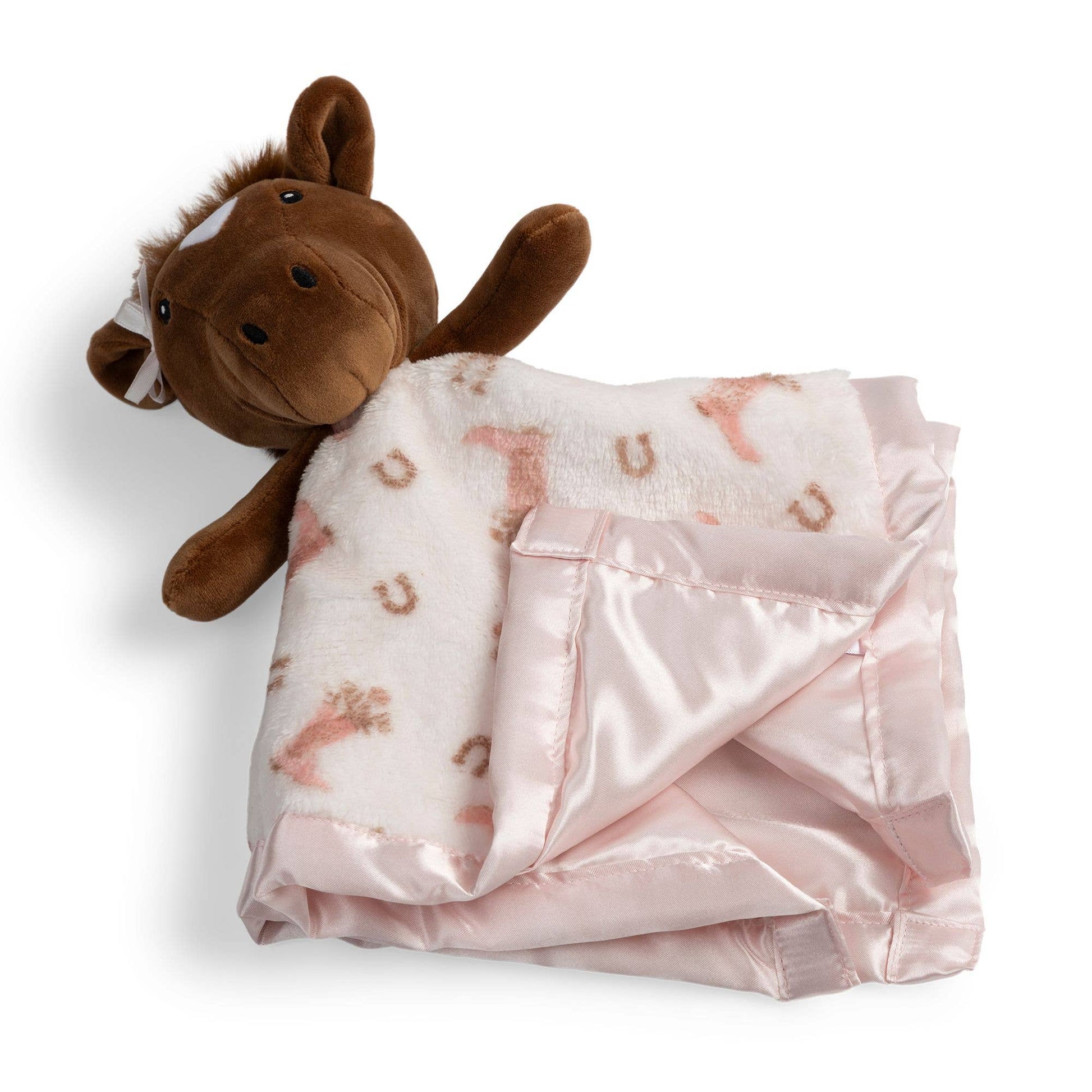 Meet your baby's new BFF! The soft and soothing Security Blanket from JuJuBe x Studio Oh! makes an irresistible companion for your little one and a treasured keepsake for years to come. With a plush character sitting atop a handkerchief-style fleece blanket and silky satin trim, it's ideal for tiny hands and cozy cuddles. The machine-washable blanket is perfectly portable at home and on the go so Baby can keep calm and carry on. • Includes a plush character atop a petite handkerchief-shaped blanket with coordinating designs • Features ultra-soft fleece with satin trim and underlay to provide warm, soothing comfort • Is an ideal size for cuddles at home or on the go Blanket: 15.5"W × 15.5"L 100% polyester, with satin trim and underside; plush character matches blanket artwork Machine washable